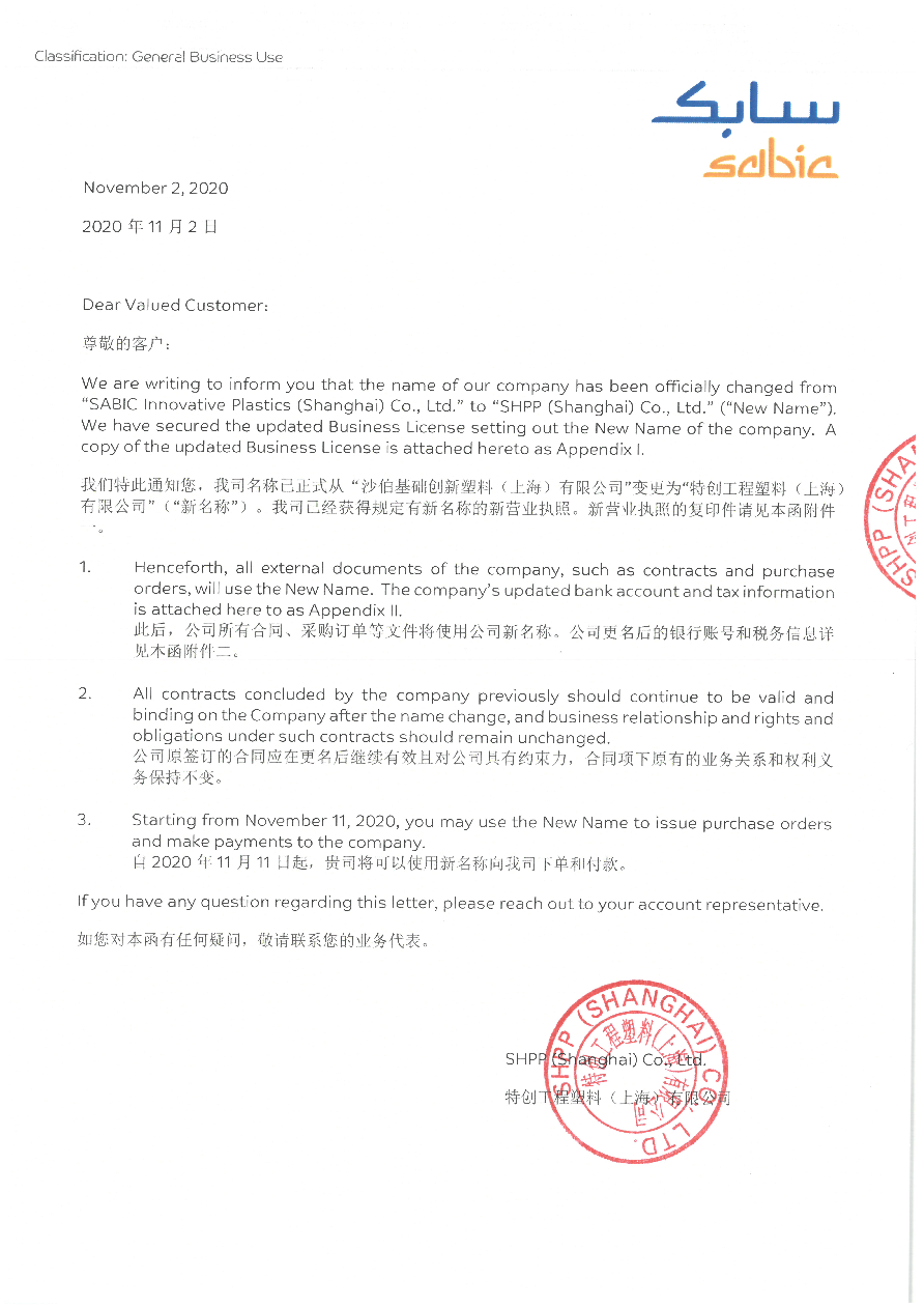 沙伯基礎(chǔ)創(chuàng)新塑料(上海)有限公司自2020年11月2日起正式更名