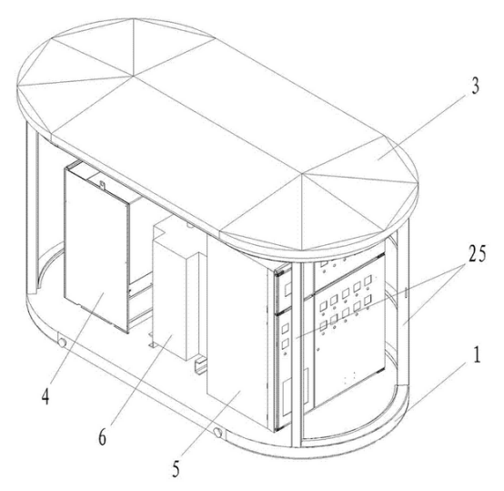 箱體外殼由材料層、龍骨與防護(hù)鋼板層三層組成,可以較好地對(duì)變電站內(nèi)的用電設(shè)備進(jìn)行較好地保護(hù);箱體外殼為橢圓柱狀,結(jié)構(gòu)更加緊密牢固。箱體外殼的前表面設(shè)置有雙開(kāi)門(mén),箱體外殼的表面均勻地設(shè)置有電纜線(xiàn)孔且所述電纜線(xiàn)孔內(nèi)貫穿有電纜線(xiàn)。與周?chē)沫h(huán)境相適應(yīng),同時(shí)也提高了變電站的通風(fēng)散熱的效率。