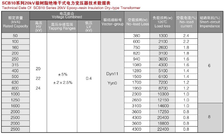 20kv級(jí)SCB10系列環(huán)氧樹脂干式變壓器技術(shù)參數(shù):