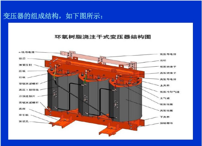 ⒊澆注式:用環(huán)氧樹脂或其它樹脂澆注作為主絕緣,它結(jié)構(gòu)簡單、體積小,適用于較小容量的變壓器。