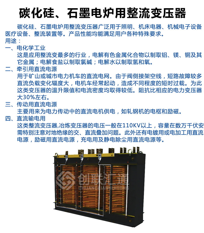 碳化硅、石墨電爐用整流變壓器廣泛用于照明、機床電器、機械電子設(shè)備、醫(yī)療設(shè)備、整流裝置等。產(chǎn)品性能均能滿足用戶各種特殊要求。