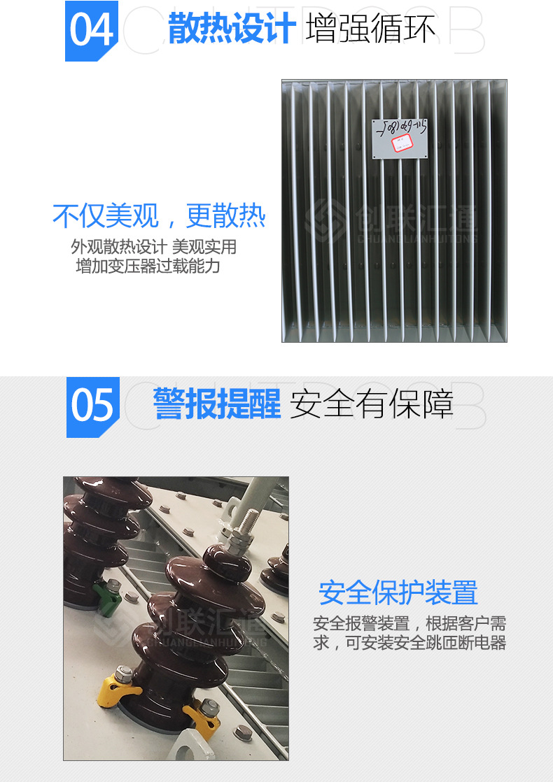 d、油箱采用波紋片,它具有呼吸功能來補償因溫度變化而引起油的體積變化,所以該產(chǎn)品沒有儲油柜,顯然降低了變壓器的高度。